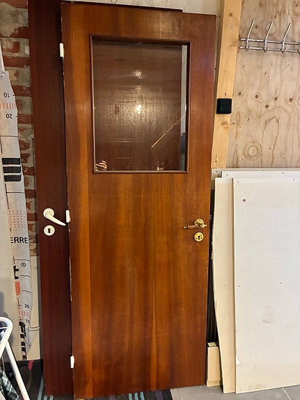 Trædør med glasvindue og messinghåndtag
