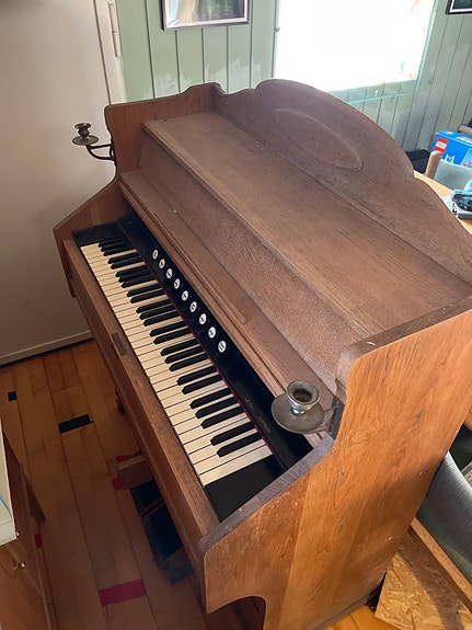 Ældre harmonium/trædeorgel med metallysestager