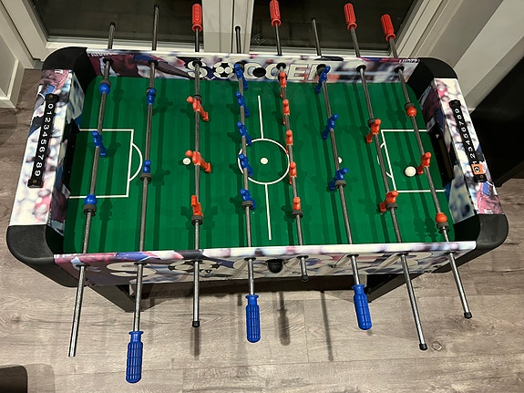 Bordfodboldbord med grøn spilleflade og blå og røde spillere