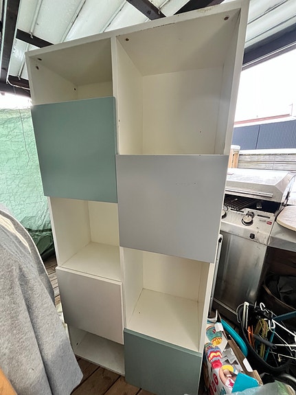 Fin hvid reol med låger (er sat på højkant)