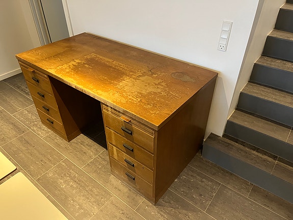 Gammelt skrivebord i træ med skuffer og udtræk