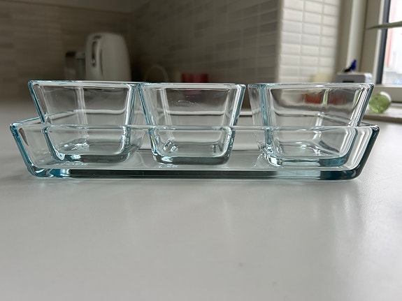 IKEA serveringssæt i glas med rektangulær bakke og tre skåle