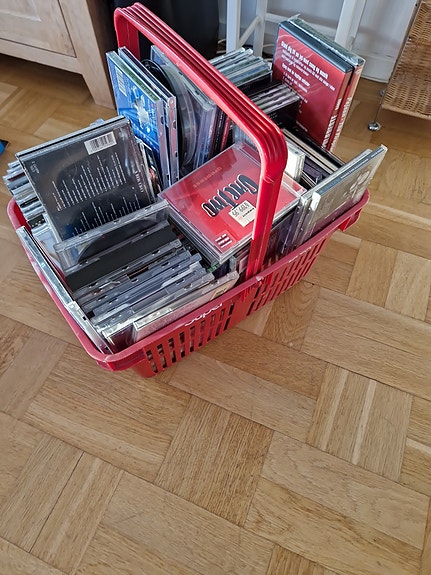 Kurv med mange cd'er. Meget blandet musik.